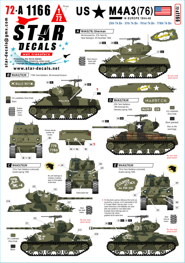Star Decals - 1/72 US M4A376 in Europe 1944-45.'Thunderbolt', 'Cool Studs Inc' etc. 25th / 37th / 761st / 778th Tk Bn.