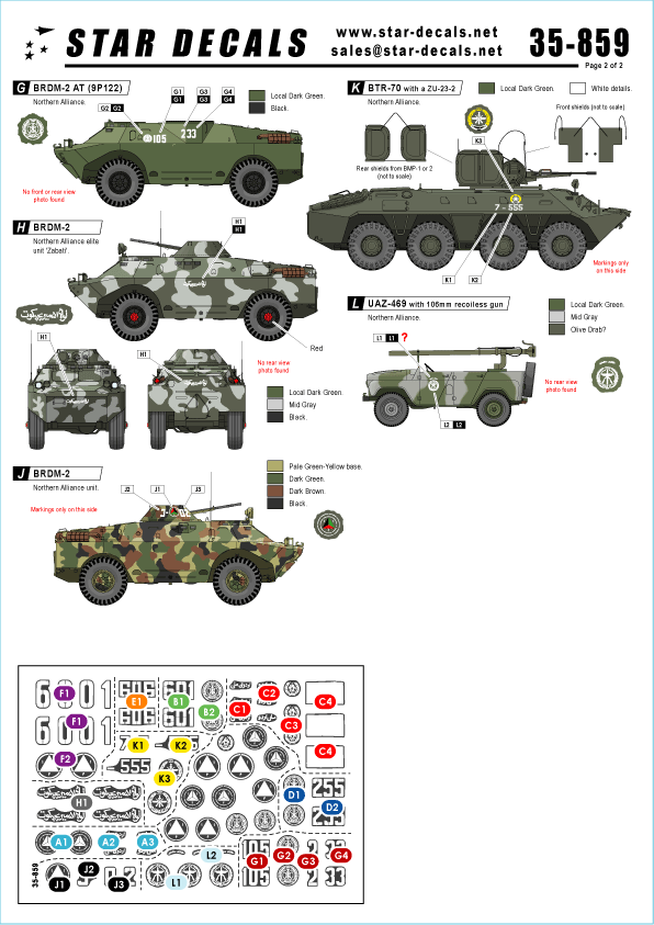 Star Decals - 1/35 Northern Alliance/Taliban/Afghanistan National Army. Russian ZSU-23-4 Shilka, MAZ 537 Tank transporter, BRDM-2 BRDM-2 Sagger (9P122), BTR-70 with ZU-23-2 gun, UAZ-469.