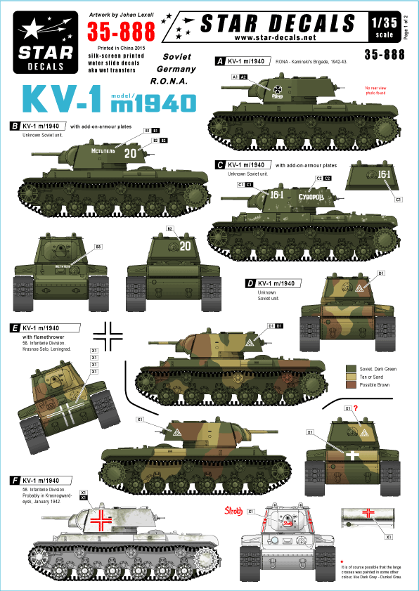 Star Decals - 1/35 Russian KV-1 model/1940. Soviet, Germany, RONA