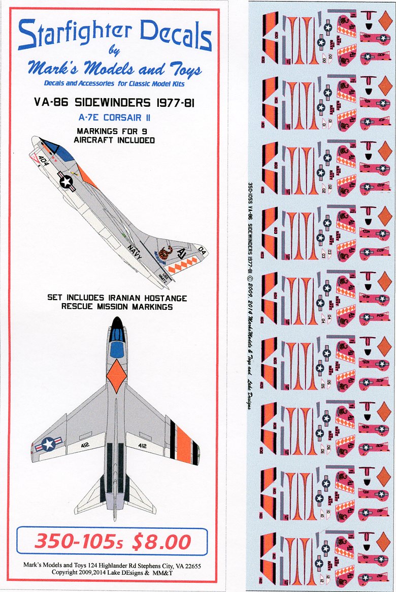Starfighter Decals - 1/350 Vought A-7E Corsair VA-86 Sidewinders. Set contains markings for 9 aircraft from VA-86 from CVW-8 from 1977-81. Set contains special recognition markings for the Iranian Rescue Mission. Set also has markings for a pair of Drop tanks as well. For use with any 1/350 Vought A-7E Corsair kit. (designed to be used with Trumpeter kits) Kits not included