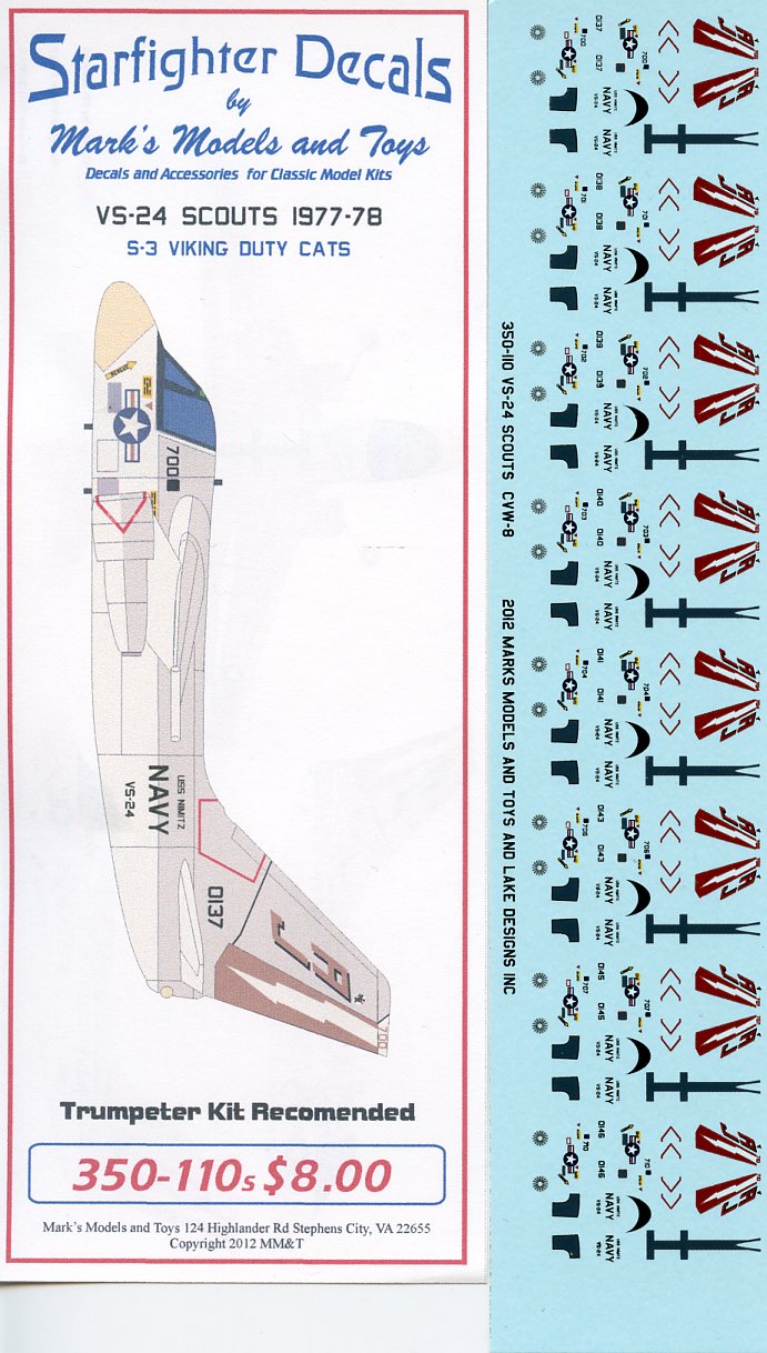 Starfighter Decals - 1/350 Lockheed S-3B Vikings. Set includes markings for 8 aircraft from VS-24 Scouts/Duty Cats from the 1977-78 cruise with CVW-8 aboard the Uss Nimitz CVN-68.