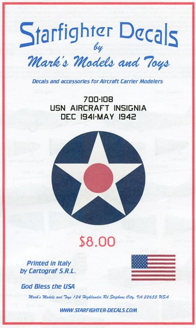 Starfighter Decals - 1/700 USN Aircraft Insignia 1919-May 1942. Replaces 700-11. Sheet contains an assortment of National Insignia and Tail Stripes used by aircraft stationed aboard USN Carriers from October 194i thru May 1942. Can be used on other US aircraft from 1919-May 1942. Tail Stripes provided for F4F Wildcats, F2A Buffalos, SBD Dauntless, and TBD Devastators. For use with any 1/700 USN Aircraft. Includes Tail Stripes used by the USN Carrier Borne Aircraft from Jan-May 1942 Color placement guide included