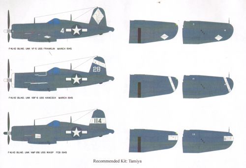 Starfighter Decals - 1/72 Bent Wing Birds Pt. 1 Corsairs in G Markings. Markings for 6 different Vought F4U-1D/FG-1D Corsairs: VF-5 USS Franklin, VFB-6 USS Hancock, VMF-216 USS Wasp, VFB-85 USS Shangri La, VF-83 USS Essex (kill markings), VMF-112 USS Bennington. Tamiya Kit