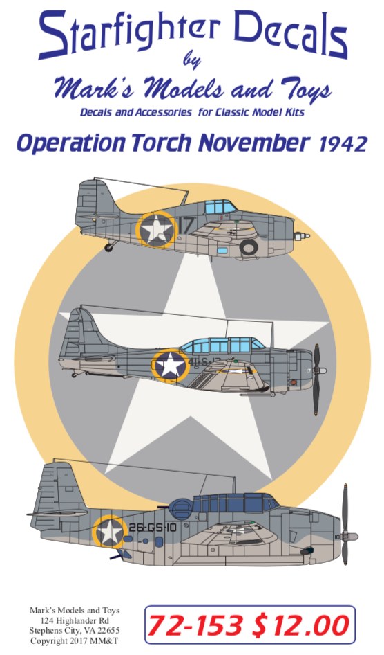 Starfighter Decals - 1/72 Operation Torch 1942. Markings for Grumman F4F-4 Wildcats, TBF-1 Avengers, Douglas SBD-3 Dauntless, Curtiss Soc Seagull, and a Piper L-4A Cub