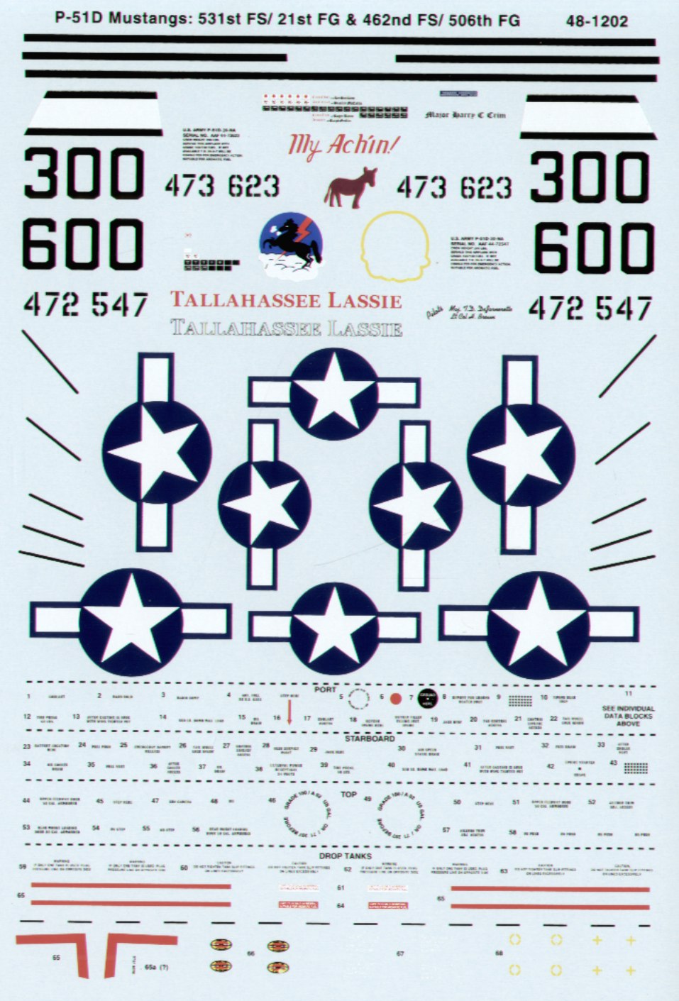 Microscale - 1/48 North-American P-51D Mustangs (2) 44-72547/600 506thFG Lt Col Harley Brown Co `Tallahassee Lassie' yellow rear fuselage and fin, 44-73623/300 Maj Harry Crim 531stFS/21stFG `My Achin!' white band on fin. Both Iwo Jima 1945