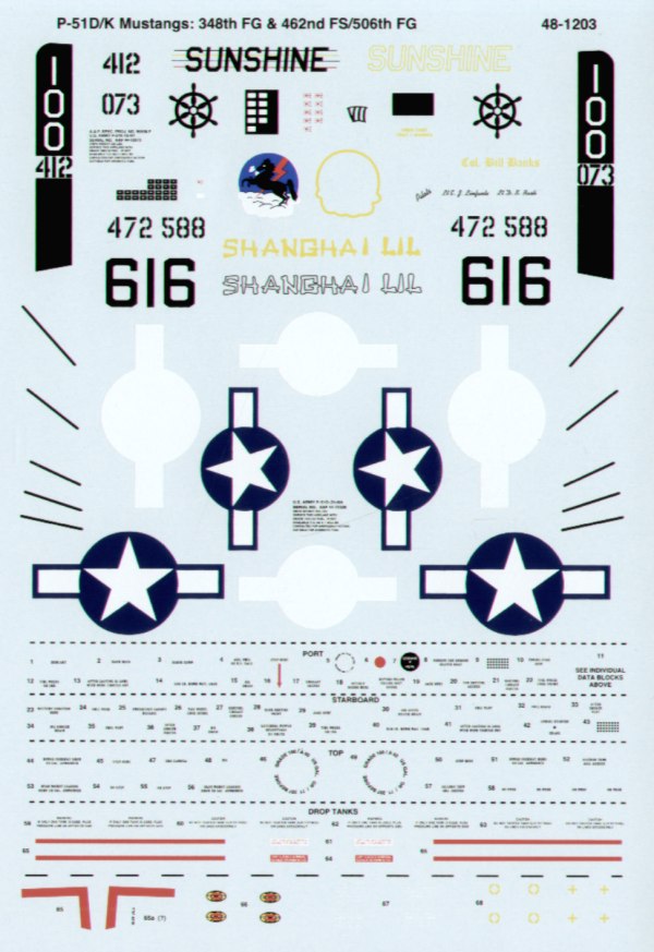 Microscale - 1/48 North-American P-51D/P-51K Mustangs (2) 44-472588/616 462ndFS/506thFG Lt D.S.Bash yellow rear fuselage and fin, 44-12072/100 348thFG/5thAF Lt Col W.Banks Co `Sunshine' black fuselage bands. Both Iwo Jima 1945