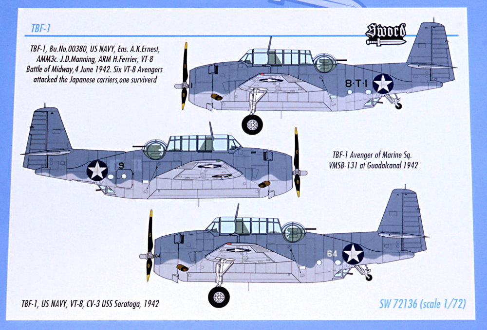 Sword - 1/72 Grumman TBF-1 Avenger over Midway and Guadalcanal. The first version of this Avenger ever produced in 1/72!. 3 decals versions