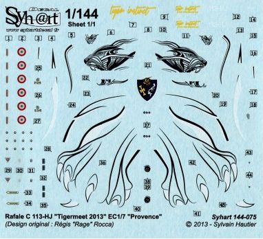 Syhart - 1/144 Scale Dassault Rafale C 113-HJ "Tigermeet 2013" EC1/7 "Provence" To save the "Tiger" traditions of the Ec 1/12 "Cambresis" after its retirement and the closure of Cambrai Ab on march 2012 (Syhart 072 & 073). The tiger badge from Cambresis squadron (SPA162) was reassigned to the