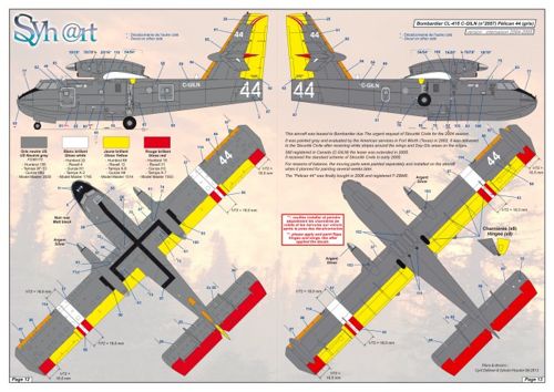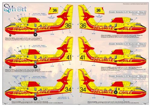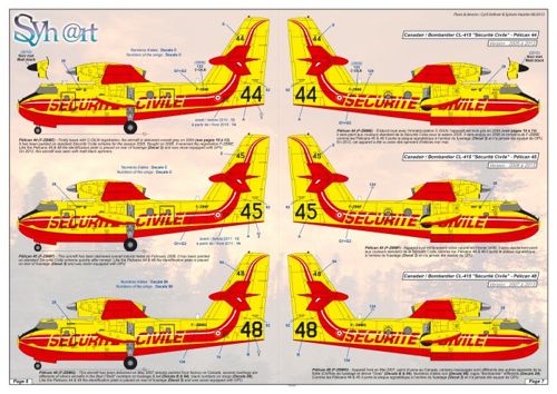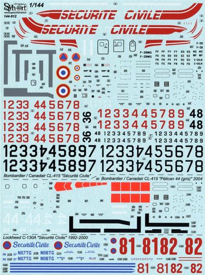 Syhart - 1/144 Scale Securite Civile Française (Part 1) CL-415 + Lockheed C-130A Hercules This decals set, including five sheets contain all the markings to complete one Canadair/Bombardier CL-415 and one C-130A Hercules in French Scurit Civile colors.
