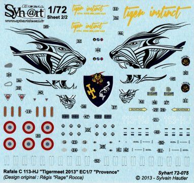 Syhart - 1/72 Scale Dassault Rafale C 113-HJ "Tigermeet 2013" EC1/7 "Provence" To save the "Tiger" traditions of the Ec 1/12 "Cambresis" after its retirement and the closure of Cambrai Ab on march 2012 (Syhart 072 & 073). The tiger badge from Cambresis squadron (SPA162) was reassigned to the