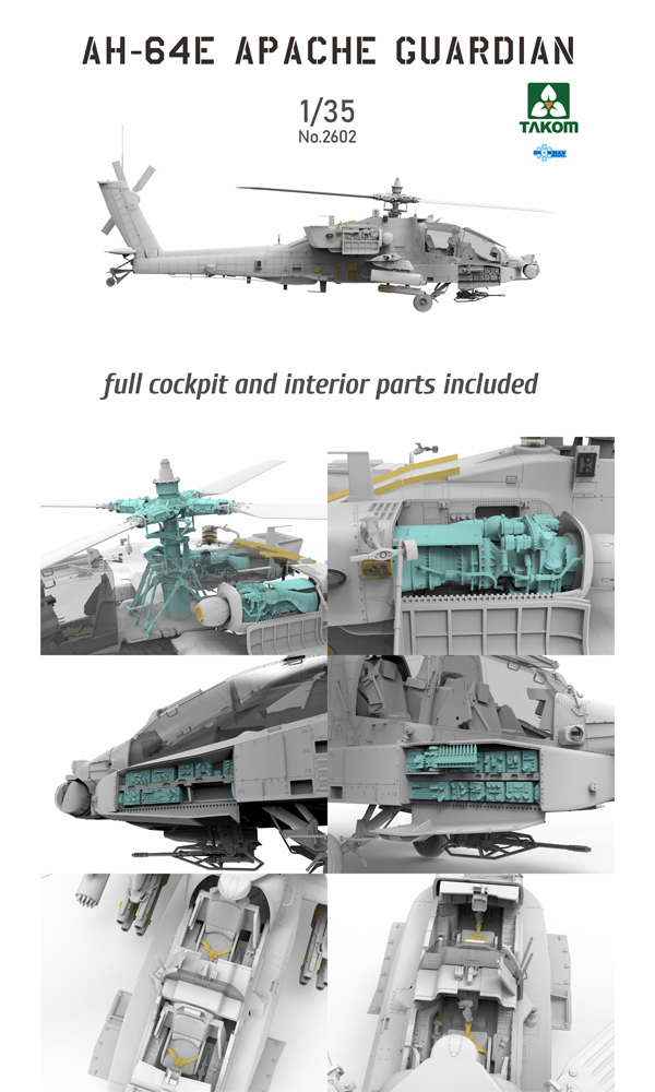 Takom - 1/35 Boeing AH-64E Apache Guardian Attack Helicopter. Advanced variant of the American close combat attack helicopter introduced by the US Army from 2013.