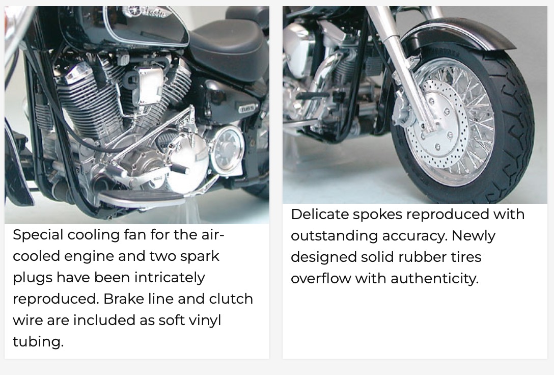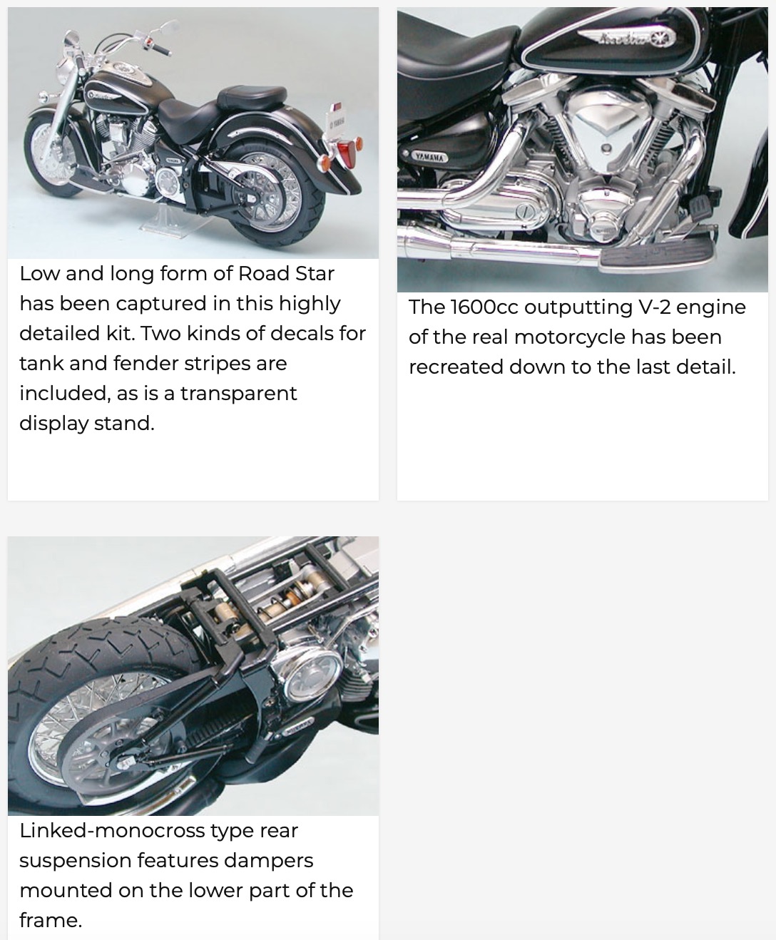 Tamiya has recreated the Road Star in stunning detail as their latest addition to the 1/12 Motorcycle Series. Overall length: 208mm, overall width 89mm, overall height: 100mm. Enjoy the fascinating assembly incorporating real screws and two kinds of metal plated parts. The delicate fins of the air-cooled engine, spoke wheels and the slender brake and clutch lines all add to the realism of this motorcycle masterpiece. Kit comes with two kinds of tank emblems one for the Japanese and American 'Road Star' and one for the 'Wild Star' as it is called in Europe. Various decals for stripes and meters are also included in this authentic kit. Transparent display stand also included.