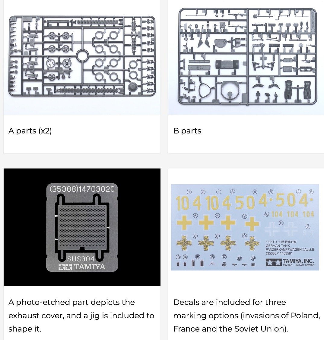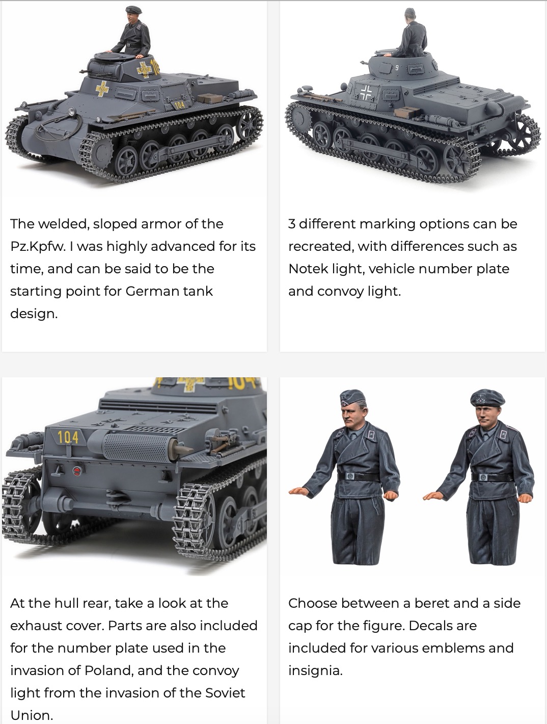 Tamiya introduces the new German Panzerkampfwagen I Ausf. tank in the 1:35 line. This means that the main German tanks of World War II are now all reproduced by Tamiya.