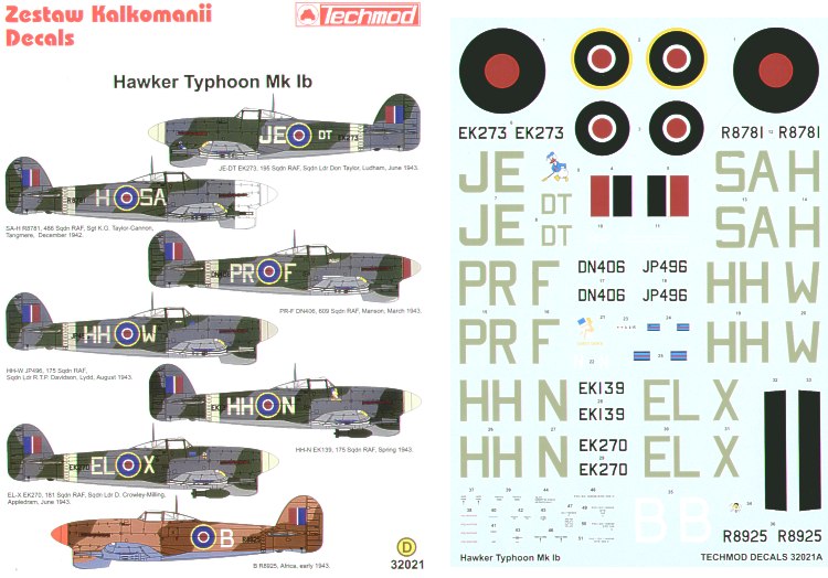 Techmod - 1/32 Hawker Typhoon Mk.Ib (7) EK273 JE-DT 195 Sqn S/L Don Taylor Ludham 1943, R8781 SA-H 486 Sqn Sgt K.G.Taylor-Cannon White nose and wing D-Day stripes with white painted over, DN406 PR-F 609 Sqn Manston 1943, JP496 HH-W S/L R.T.P. Davidson, EK139 HH-N Both 175 Sqn, EK270 EL-X 181 Sqn S/L D.Crowley-Milling, R8925/B Desert camouflage schemes Dark Earth/Mid Stone/Azure Blue