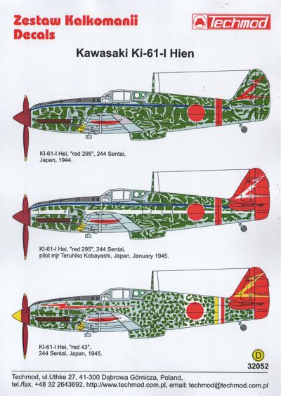 Techmod - 1/32 Kawasaki Ki-61-I Hien Ki-61-I Hei "red 295", 244 Sentai, Japan, 1944. Ki-61-I Hei "red 295", 244 Sentai pilot mjr Teruhiko, Japan, January 1945. Ki-61-I Hei, "red 43", 244 Sentai, Japan, 1945.