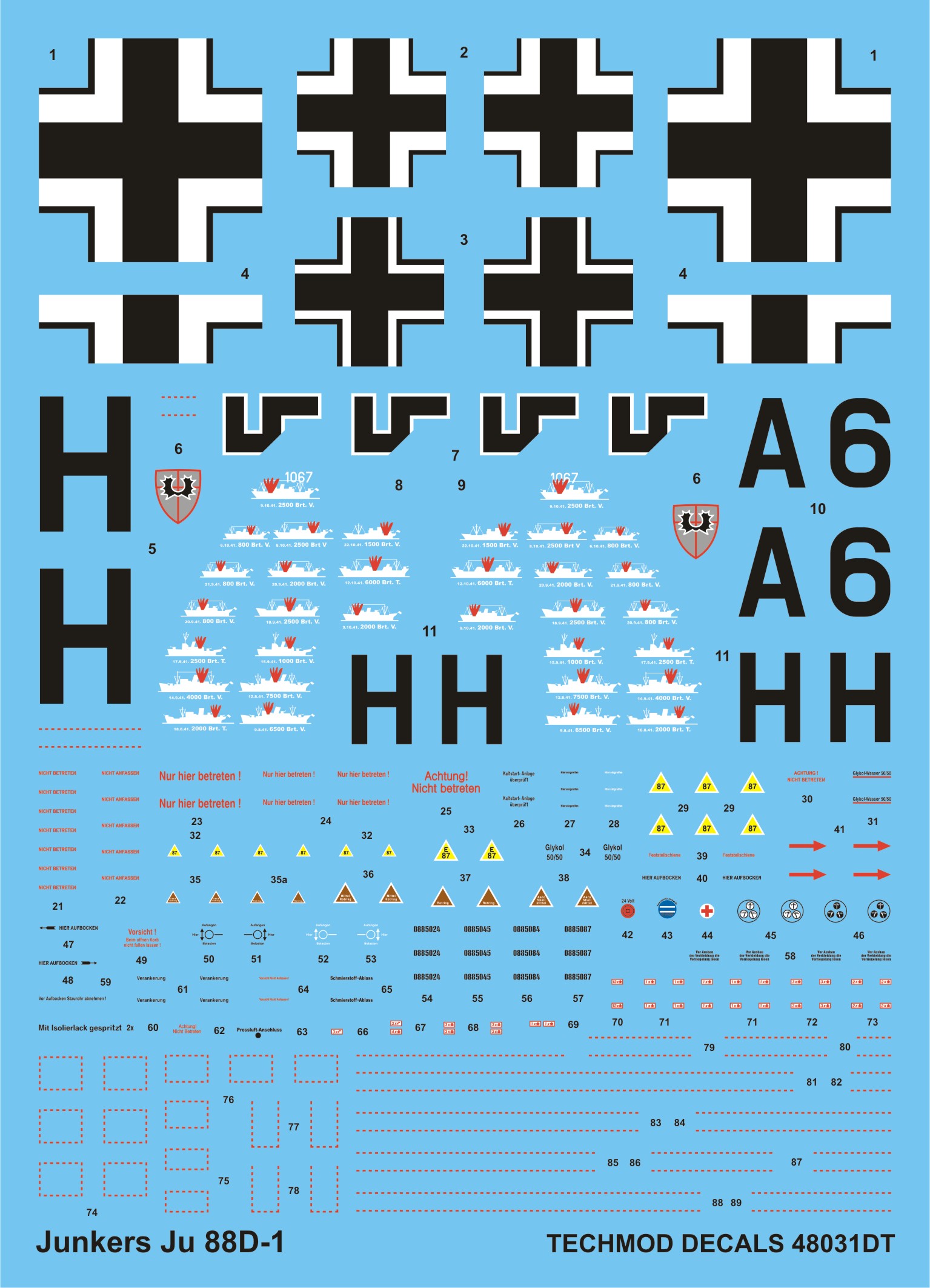 Techmod - 1/48 Junkers Ju-88D-1 (1) A6+HH III/KG 30 Oberst Werner Baumbach Norway 1942. Includes lots of stencil data and ship kill markings on fin