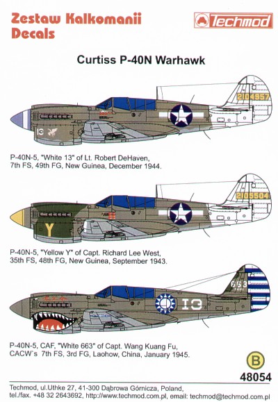Techmod - 1/48 Curtiss P-40N Warhawks (3) 2104957 White 13 7 FS/49FG Lt DeHaven New Guinea 1944, 2105504 Yellow Y 35 FS/48 Fg Capt Lee West New Guinea 1943, both with White tails, White 653/13 7 FS/3 Fg Chinese Air Force shark mouth.