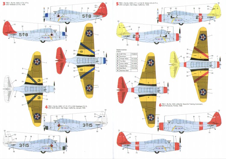 Techmod - 1/48 Douglas Douglas TBD-1 Devastator Pre War (6) 42-S-16 VS-42 Uss Ranger 1941 overall grey; 6-T-16 VT-6 Uss Enterprise Blue tail; 5-T-8 VT-5 Uss Yorktown Red tail 1939; 3-T-15 VT-3 Uss Saratoga White tail 1938; 2-T-1 VT-2 US Lexington Yellow tail 1938; White 82 Naval Air Training Command Nas Pensacola Red tail. All aluminium fuselages with yellow wings. Inc Paint masks