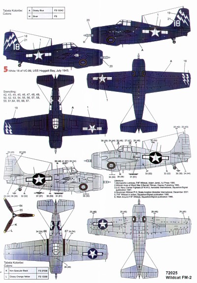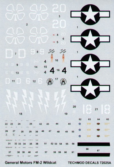 Techmod - 1/72 General-Motors FM-2 Wildcat (5) Black 4 VC-13 Uss Tripoli 1944 Dark Gull Grey/White, White D6 'Judy' or D9 'The Reluctant Maid' both VC-14 Uss Hoggatt Bay 1944 3 tone camouflage, White 20 VC-83 Uss Petrof Bay, White 18 VC-99 Uss Hoggatt Bay, both overall Gloss Sea Blue 025