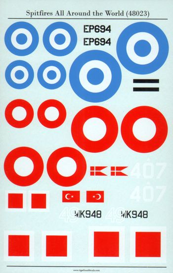 Tigerhead Decals - 1/48 Supermarine Spitfire Mk.Vc Spitfires All Around the World. It is possible to make 3 full profiles. It is suitable for 1/48 Eduard, Hasegawa and Italeri Spitfire Mk.Vc kits. - Danish Air Force 1946 - Turkish Air Force 1948 - Hellenic Air Force 1946