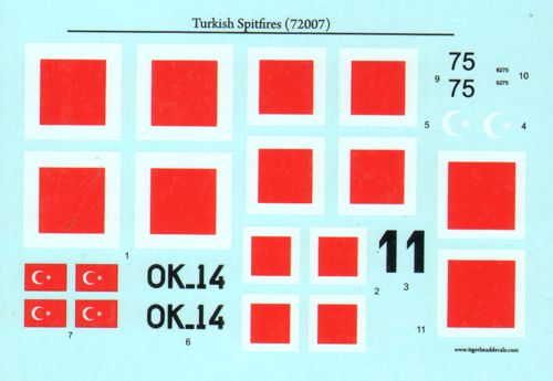 Tigerhead Decals - 1/72 Scale Turkish Spitfires. The Spitfires designed and produced by the British firm Vickers Supermarine participated the Battle of Britain and most probably they are the most popular fighters of WWII. Different models arrived Turkey at different times. A batch of 15 Spitfire Mk.Is were ordered together with the Hawker "Hurricanes" but only 3 of them were delivered. One of them which was an ex-Polish order arrived in Separt 1938. The other two arrived in 1940. Eventhough serials 4501 to 4515 were allocated by the TuAF they were never used. The planes were deployed at the 42nd Hunter Company. Two of them were returned to Rafme in 1942. The Mk.Is were equipped with a Rolls Royce Merlin-2 engine with an output of 1030HP. Their armament consisted of 8 pieces 0.303 caliper MGs. They were distinctive with their 3-blade propeller.