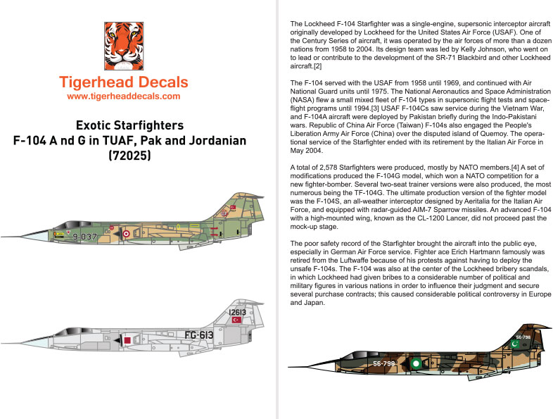 Tigerhead Decals - 1/72 Exotic Starfighters (Lockheed F-104 Starfighters in TUAF, Pak and Jordanian)