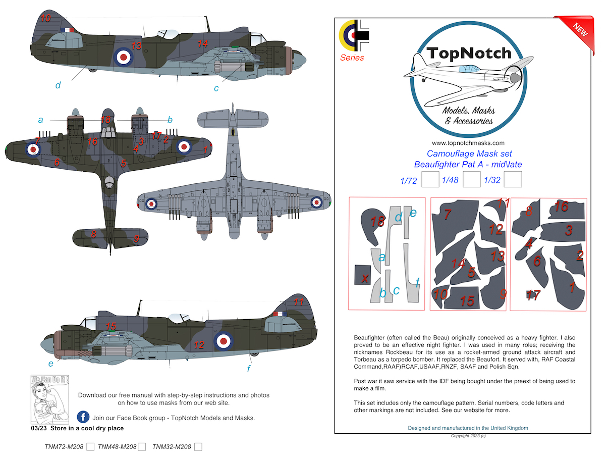 Top Notch - 1/72 Bristol Beaufighter Mid/Late Pattern A camouflage pattern paint masks