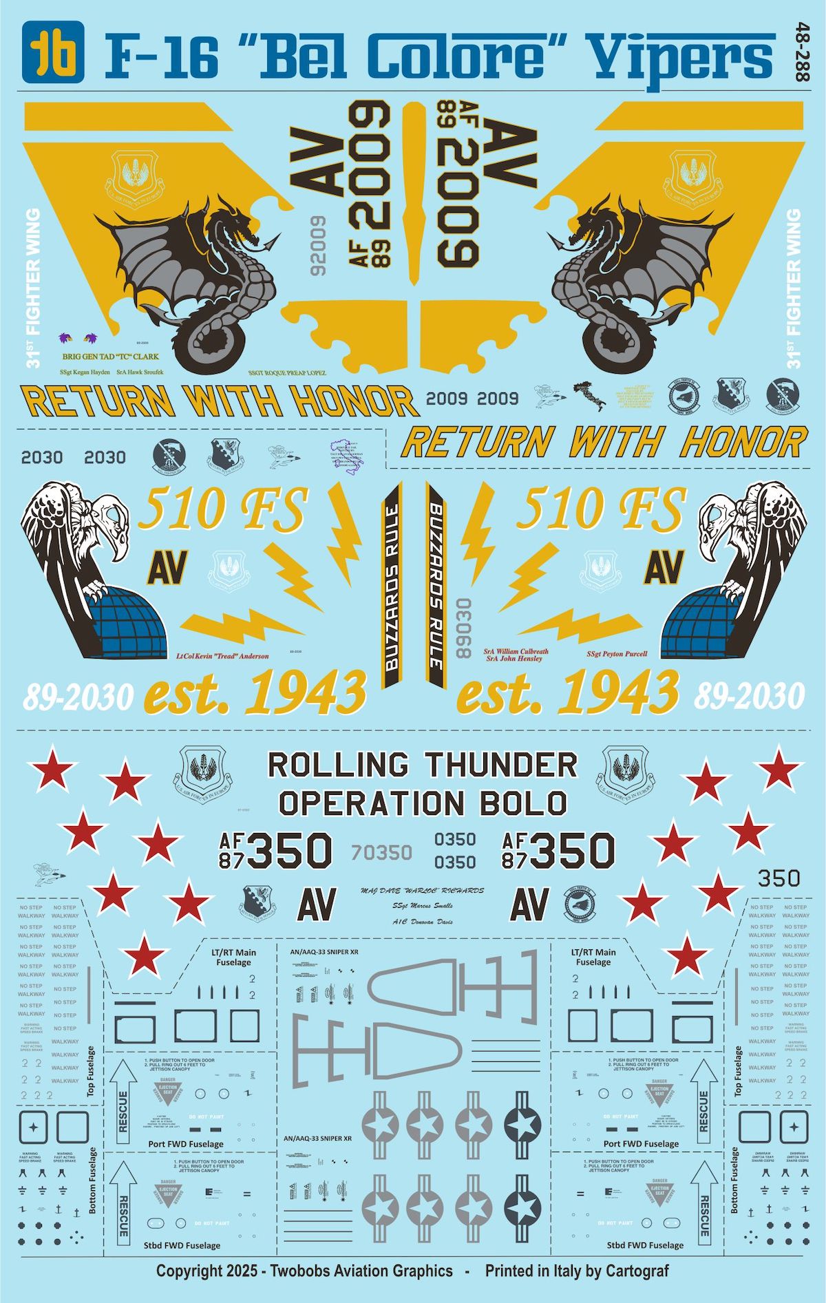 Two Bobs - 1/48 Lockheed-Martin F-16C Bel Colore Vipers. The 31st Fighter Wing from Aviano AB, Italy is assigned to the United States Air Forces in Europe and is the only US fighter wing south of the Alps. This strategic location makes the wing an important component that supports operations in NATO's southern region.Along with the 31st Wing, the 510th and 555th Fighter Squadron painted three of their jets in commemorative 'Heritage Schemes' during 2023/2024. These paint schemes commemorate various historical aspects of the units past.This decal sheet contains markings for all three aircraft. With the supplied stencils, there are enough markings to build two complete aircraft.Stencils included are for the Tamiya kit but major markings can be used on the Kinetic and Hasegawa kit as well.