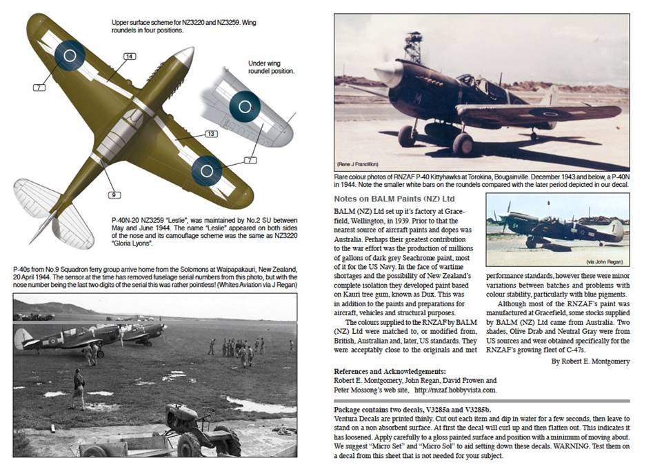 Ventura - Rnzaf Curtiss P-40Ns, Gloria Lyons and Leslie 1/32nd scale decal