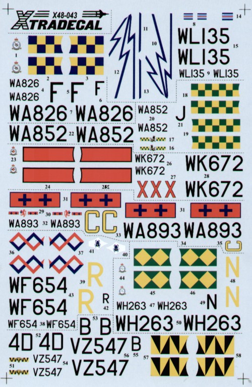 Xtradecal - 1/48 . For new Airfix kit. Gloster Meteor F.8 (9) WA826/F or WL135 245 Sqn, WA852/J 257 Sqn, WK872/X 247 Sqn, WA893/C 263 Sqn, WF654/R 64 Sqn, VZ547/B or 4D-B, WH263/N 616 R.AuxAF. Use kit roundels, data etc.