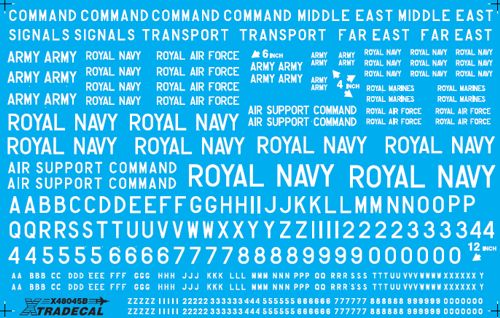 Xtradecal - 1/48 Raf White Letters, Numerals 4" ,8" and 12" and Titles for Royal Air Force, Royal Navy, Army, Air Support Command etc double sheet. (PICTURES Are In BLACK. Sheet Are Printed In WHITE) (RAF codes/RAF code letters/RAF serial numbers)
