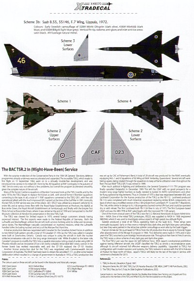 Xtradecal - 1/48 Bac TSR-2 What If Part 3 (6) Japan 501st Hikotai 2008, Rcaf 325 Alouette Sqn 1983, Sweden F.7 Wing in Early Camouflage 1972 or 'Viggen' Splinter Camouflage 1987, Armee de l'Air EB1/91 1994 or 30th Anniversary 2000