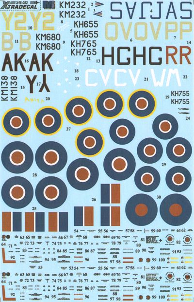 Xtradecal - 1/48 North-American P-51D Mustang in Raf service (6) KH655 QV-P 19 Sqn Raf Peterhead, KM680 Y2-B 442 (RCAF) Sqn Po A.J.Mallandine 'Edmonton Special'RAF Hunsdon May, KH755 CV-W 3(RAAF) Sqn 'Anita' Italy, All OD/Dk Grey/Med Grey. KH765 HG-R 154 Sqn Alex Forsyth Raf Hunsdon, KM138 AK-Y 213 Sqn Italy, KM232 Jas Wg.Cdr J.A.Storrer Wing Ldr Raf Hunsdon. Last 3 overall Aluminium. All 1945.