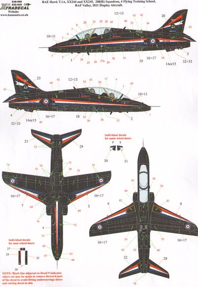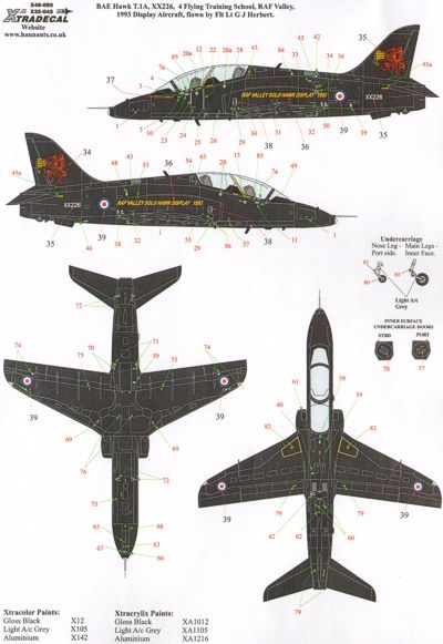 Xtradecal - 1/48 BAe Hawk T.1A (2) XX244 or XX245 208(R) Squadron, 4 Fts Raf Valley 2011 Display Aircraft flown by Flt.Lt. Jules Fleming, XX226 4FTS Raf Valley 1993 Display Aircraft with Valley Dragon logo on fin.