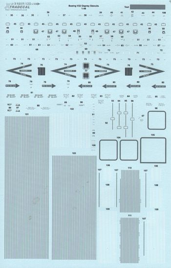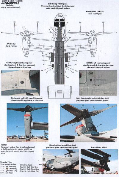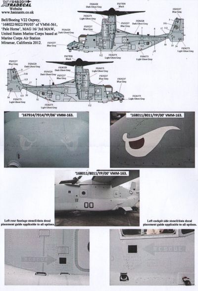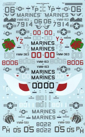 Xtradecal - 1/48 Bell-Boeing V22 Osprey (4) 167914 YP/06 VMM-163 Ridge Runners lo-viz; 168006 YZ/00 VMMM-363 Lucky Red Lions; 168011 YP-00 VMM-163 Ridge Runners coloured markings; 168022 PH/o5 VMM-561 Pale Horse lo-viz. All MCAS Miramar 2012. With full data markings.