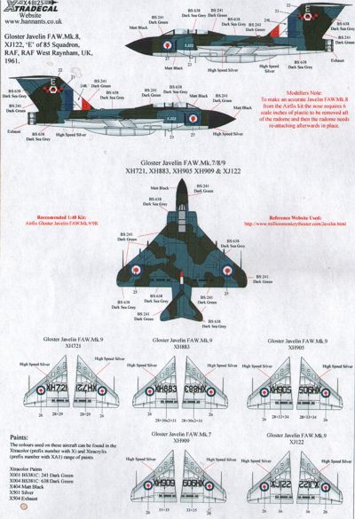 Xtradecal - 1/48 Scale Gloster Javelin Faw Mk.9 Part 1 (5) XH721 Mhm flown by Wing Co Michael Miller 60 Sqn Raf Tengah 1961; XH883 25 Sqn Raf Waterbeach 1960; XH905/E 5 Sqn Raf Geilenkirchen 1960s; XH909/R 25 Sqn Raf Waterbeach 1958; XJ122/E 85 Sqn Raf West Raynham