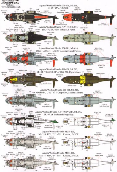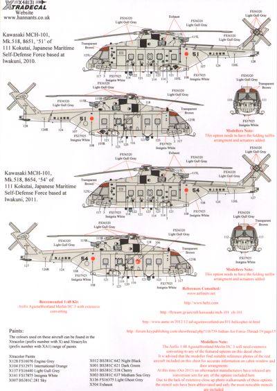 Xtradecal - 1/48 Agusta/Westland Merlin (8) CH-101 Mk.518 8192 '92' Japanese Maritime Self-Defence Force aboard Antarctic survey vessel 2010 overall FS26076 Engine Grey with orange trim; AW-101 Mk.641 ZR342 UK Test Serial IND05 prior to delivery to Indian AF 2012; AW-101 Mk.610 ZR331 MS-21 due for Algerian Naval Forces during trials at RAF St.Mawgan 2011 overall Med Sea Grey; EH-101 Mk.512 M-508 'Rescue 08' ESK 722 R. Danish AF Karup 2009; EH-101 Mk.410 MM81494 2-15 Italian Navy La Spezia-Luni 2010 overall FS36375; AW-101 (VVIP) Mk 643 ZR337 Turkmenistan Airlines 2013 overall white; MCH-101 Mk.518 8651 '51' or 8654 '54' both 111 Kokutai Japanese Maritime Self-Defence Force, Iwakuni 2010 both Lt Gull Grey over white. Basic kit will need modification to window layout for all of these aircraft.