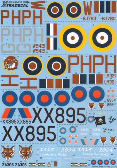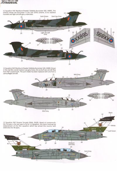 Xtradecal - 1/48 12 Sqn History to 2014 (6) Vickers Wellington Mk.II W5421 PH-G Merlin engines lost on raid on Aachen 5/8/41, Wellington Mk.III BJ780 PH-W lost 8/10/42, Avro Lancaster B.III LM321 PH-H with nose art lost 10/6/1944 Acheres, Blackburn Buccaneer S2B XX895 mid 1970s, XX885 mid 90's overall MSG ex Gulf War, Panavia Tornado GR.4A ZA395 RAF Lossiemouth disbandment scheme 2014 Production delayed, due end October