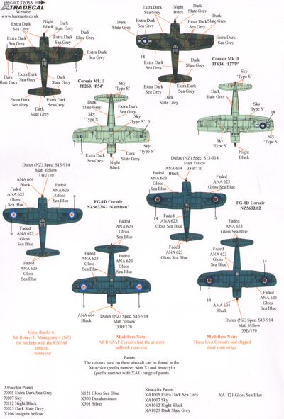 Xtradecal - 1/48 Vought F4U-1 Corsair II/Goodyear FG-1D (4) JT260 P54 757 NAS HMS Unicorn 1944, JT634 13-7/P 1834 NAS HMS Victorious 1944, NZ5632/32 Iwakuni 1946 or Bofu Japan 1948 with different styles of roundels. NOTE This decal and instructions are incorrectly numbered X32055, it is 1:48 scale. NZ5632/32 is also on X48136