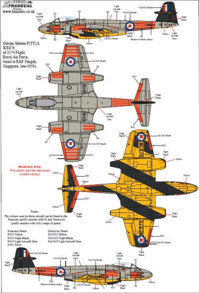 Xtradecal - 1/48 Gloster Meteor F(TT).Mk.8 Pt 3 (1) WE876 1574 Flight RAF Tengah, Singapore 1950s with full day-glo orange striping. This day-glo orange striping is typical of that used by the RAF and with adjustment can be used on many aircraft types.[Gloster Meteor F.8]