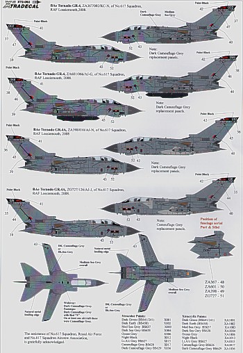 Xtradecal - 1/72 Scale Reprinted. 617 (Dambusters) Squadron 1943-2008 (10) Avro Lancaster Mk.III ED906 AJ-J Fl.Lt D.J.H Maltby DFC, the fifth Lanc to attack the Mohne Dam 16/17 May 1943 causing the breach. Avro Lancaster Mk.I NG494 KC-B April 1945 with bulged bomb bay for Tallboy bomb; Avro Lancaster Mk.VII NX791 KC-E Digri India 1946 White top/black undersurfaces; Mustang III HB837 flown by Wg.Cdr.Leonard Cheshire DSO/DFC as Pathfinder 1944; de Havilland Mosquito Mk.VI NT202 AJ-N Pathfinder 1944; Avro Vulcan Mk.2 XL392 Raf Scampton 1978; Panavia Tornado GR.4 ZA367/002/KC-4; ZA601/066/AJ-G; GR.4A ZA398/010/AJ-N; ZG727/126/AJ-J all in modified 2008 scheme Raf Lossiemouth. (keyword search info Avro Lancaster Mk.I/III) ------(V Bombers/V-Bombers/V.Bombers)