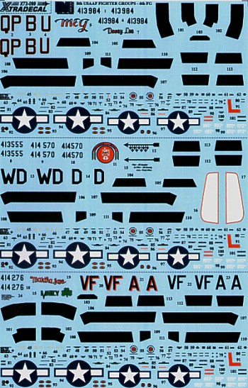 Xtradecal - 1/72 North-American P-51D Mustangs from the 4th Fg (3) 334 FS. 44-413984 QP-B Lt C.Boresky `Meg' 2 versions, 44-413984 QP-U Lt Marvin Arthur `Davey Lee', 335 FS. 44-13555 WD-D Capt Ted E.Lines `Thunderbird' or 44-14570 WD-D, 44-14570 WD-D Lt C.Konsler 2 versions, 336 FS. 44-14276 VF-A Capt F.Young `Martha Jane' 2 versions, 44-14276 VF-A Lt James McMahon `Marcy'