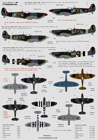 Xtradecal - 1/72 Scale Reprinted! Supermarine Spitfire Mk.IXc (9) BS353 AE-G Norman Keene; EN358 AE-B Ian Keltie later Wg.Cdr.Jonnie Johnson. Both 402 (RCAF) Sqn Raf Digby 1943; EN446 QJ-I 92 Sqn Italy 1943; MH358 YT-JAS Sqn.Ldr James Storer Co 1943; MH737 FF-Y 122 Sqn Flt.Lt. V.J.Sumpter Raf Detling 1943; MJ883 VZ-B 412 (RCAF) Sqn George Buzz Buerling 30 kills 1944; MJ532 UF-G 43 Sqn Italy 1944; MK126 5J-G 126 Sqn Raf Harrowbeer 1942; MH819 NN-M 310 (Czech) Sqn Raf Appledram June 1944 with full D-Day stripes.