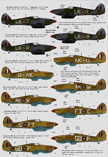Xtradecal - 1/72 Hawker Hurricane Mk.IIc (18) BE500 LK-A 87 Sqn 1942, BE581 JX-E 1 Sqn Flt.Lt K. M. Kuttlewascher , BD936 ZY-S 247 Sqn Exeter 1942. Overall black, BE581 JX-E 1 Sqn. HL864 LK- 87 Sqn 1942, HL865 LK-R 87 Sqn Green/Ocean Grey top, black undersurfaces, BD867 QO-Y 3 Sqn Martlesham Heath 1941, BN964 JX-S 1 Sqn 1942, HL603 JX-I 1 Sqn 1942. All Day Fighter camouflage BE543 AK-U 213 Sqn P/O Bert Houle Western Desert 1942, HL887 AK-W 213 Sqn 1942, HV817 FT-C 43 Sqn Algeria 1942, HL851 GO-P 94 Sqn `The MacRobert Fighter-Sir Iain' Egypt 1942, HL973 RZ-G 241 Sqn 1943, BP588 RS-X 33 Sqn S/Ldr S.C.Norris Co 1942. All North Africa camouflage Dk Earth/Mid Stone/Azure Blue. LB935/L 34Sqn or 4 Sqn Indian AF, KZ371/R 1 Sqn Indian AF. Both Day Fighter camouflage with Seac roundels. LD349 MU-N 60 Sqn Burma 1945 Dk Green/Dk Earth/Med Sea Grey.