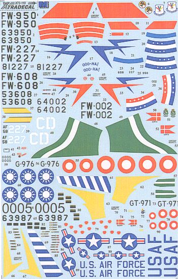 Xtradecal - 1/72 North-American F-100D Super Sabre/North-American F-100F Super Sabre Two Seat Part 2 (8) North-American F-100F 56-3950 1FDS 413DFW Lt.Col Chuck Yeager 'City of Barstow' George Afb 1958, 48-1227 1961, In August 1959 was the first single engine jet to fly over the North Pole or North-American F-100D Super Sabre 55-3608 'OO-HA', both 416TFS 21TFW Misawa AFB, 56-4002 21 Tfw Misawa Afb 1961, 58-18227/CD 524TFS 27TFW Vietnam Wild Weasel 1960, 56-3987 0005 22FBS 4FBW Republic of Chine Air Force Taiwan 1960, 56-3976 G-976 Esk 730 1970s, GT971 56-3971 Esk 727 1970 camo, R. Danish AF.