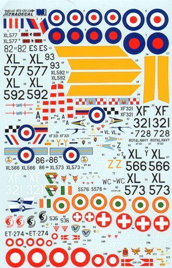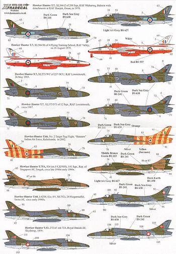 Xtradecal - 1/72 Hawker Hunter T.7 Two Seaters (20) Raf XL577/82/ES 229 OCU/234 Sqn Raf Chivenor 1960, XL592/93 229 OCU/145 Sqn Raf Chivenor 1960-63, XF321/A 56 Sqn Raf Wattisham 1964 or XF321/TZ 8/43 Sqn/1417 Flt Raf Khormakar Aden 1966, XF321/728 Air Direction Unit Rnas Yeovilton 1972 with hook, XF321 Rae Bedford 1980 Raspberry Ripple, XL566/TW3 8/43/208 Sqns Raf Sharjah 1967, XL566/Y or Z 208 Sqn Raf Muhurraq 1968 or 1970, XL566/86 4 Ftu Raf Valley 1979, XL573/WC or /573 237 Ocu or 12 Sqn Lossiemouth 1985 or 87, Indian Air Force No 2 Target Tug Flt 2002, 536 ex XF950 141 Sqn Rep of Singapore Air Force 1990s, J-4204 24 Fliegerstaffel Swiss Air Force 1959, No 272 Esk 724 R. Danish Air Force 3 versions 1959 1965, No 274 Esk 724 R. Danish Air Force 1974.