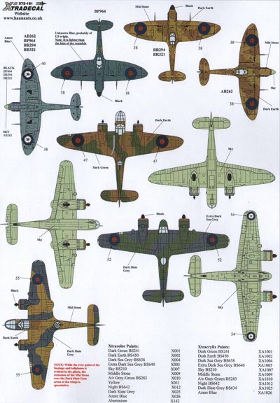 Xtradecal - 1/72 The Battle for Malta RAF - Gloster Gladiator N5519/R 1940; Hawker Hurricane IIa Z2403 GL-P 185 Sqn 1941; BE402 LE-S 242 Sqn; Z2827/M Malta Night Fighter Unit; Z2491 HA-D 126 Sqn Sgt Greenhalgh; Supermarine Spitfire Mk.Vb AB262 GN-B 249 Sqn F/O Robert McNair 1942; BP964 X-I 601 Sqn Sgt Dickson; BR294 GL-E 185 Sqn; BR321 GL-J 185 Sqn Flt.Lt John Plagis; Bristol Blenheim IV V6014 GB-J 105 Sqn; Beaufighte IC T3317 XK-? 272 Sqn S/Ldr A.W.Fletcher; Beaufort Mk.I AW340/A 39 Sqn