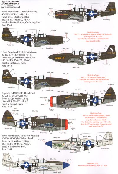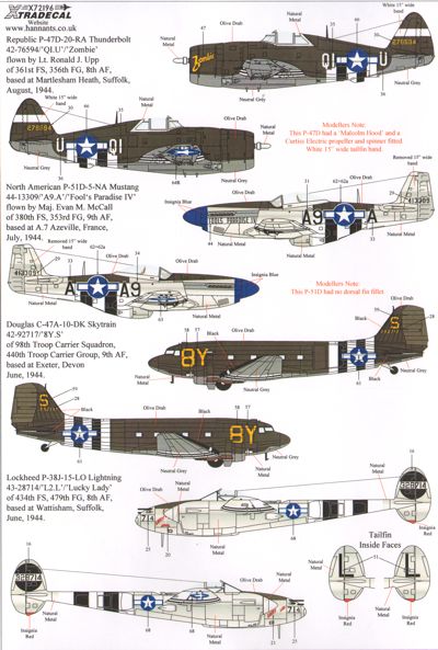 Xtradecal - 1/72 Scale D-Day 70th Anniversary June 1944 Pt 3, US Army 8th and 9th Air Forces (12) P-51B Mustang 43-6523 YF-E 358thFS, 355thFG Lt Charles W.Blair 'Leakin Lizz' Steeple Morden; 43-12375 FT-E 353rdFS, 354thFG Capt D.M.Beerbower 'Bonnie B' Lashenden; 42-106434 GQ-B 355thFS,354thFG Lt William B.King 'Atlanta Peach' Lashenden; P-51D Mustang 44-13309 A9-A 380thFS,353rdFG Maj E.M.McCall 'Fool's Paradise IV' A.7 Azeville; F-6C Mustang 42-103368 5M-G Capt John F.Hoelker 15thTRS,10thPG (Reccon), St Dizier; P-47D 42-76584 QI-U 161stFS,356thFG Lt Ronald J.Upp 'Zombie' Martlesham Heath; 42-25846 R3-G 410thFS,373rdFG A-29 St James, France; 43-22515 UN-T 63rdFS, 56thFG Capt W.L.Flag 'Ann K', Boxted; P-38J E6-X 402ndFS,370thFG Andover; 43-28714 L2-L 434thFS, 479thFG 'Lucky Lady' Wattisham; F-5E Lightning 43-28619 27thPRS, 7thPG(R) 'Rita Ruth' Mount Farm, Oxon; Douglas C-47A Skytrain 42-92717 8Y-S 98th Troop Carrier Sqn,44th TCG, Exeter.