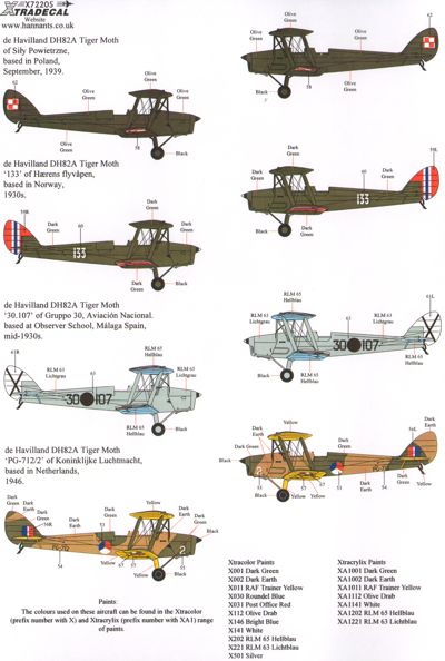 Xtradecal - 1/72 de Havilland DH.82A Tiger Moth Pt 3 Overseas Military Operators (14) S-11 Flyveskolen Kongelige Danske Flyveva bnet, Denmark 1930, overall Silver, 2-1-2 Forca Aerea Brasileira, Brazil 1935 overall Silver, DE745 Dorothy 353rd Fighter Gp USAAF Goxhill, N.Lincs 1943 Dk.Earth/Dk.Green/Yellow, T-2 Belgisch Militaire Vliegwezen, Belgium 1950, overall Silver, 002/V Koninklijke Marine, Netherlands 1950s overall Yellow, DE-832/9 French Pilots School, Armee de lAir, France 1948 Dk.Earth/Dk.Green/Yellow, 152 Imperial Iranian AF 1938-39, overall Silver, 107 Forca Aerea Portuguese 1937-40 Dark Blue/Yellow, 53 SK.11 Flygvapnet 1932 Red/Yellow, No 5 Escadrille 2/595 Vichy French AF, Indochina 1941 overall Silver with Yellow/Red nose, Poland 1939, overall Olive Green, 133 Haerens Flyvapen, Norway 1930s, overall Dk.Green, 30.107 Gruppo 30, Aviacon Nacional, Makaga, Spain 1930s overall Lt Grey RLM63, PG-712/2 Koninklijke Luchtmacht, Netherlands 1946 Dk.Earth/Dk.Green/Yellow,