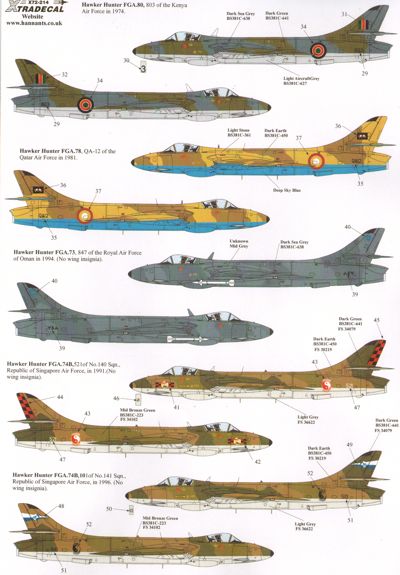 Xtradecal - 1/72 International Hawker Hunters (15) Indian Air Force BA360A Target Towing Flt 1970s, BA312A The Banners Target Towing Flt 2001, Royal Saudi Air Force 60-602 1960s, Abu Dhabi Air Force No 701 1969, Chilean Air Force No 734 8 Grupo 1976 (ex RAF XF317), Kenya Air Force No 803 1974, Quatar Air Force QA-12 1981, RAF of Oman No 847 1994, Rep of Singapore Air Force No 521 140 Sqn 1991 and No 101 of 141 Sqn 1996 lo viz, Royal Rhodesian Air Force RRAF121 1963, 1821 1968, Rhodesian AF R1821 1970, Air Force of Zimbabwe No 98 1981, Kuwait Air Force No 212 1960s. This was Xtradecal X72063 but has now had the Rhodesian/Zimbabwe Hunters revised and corrected.